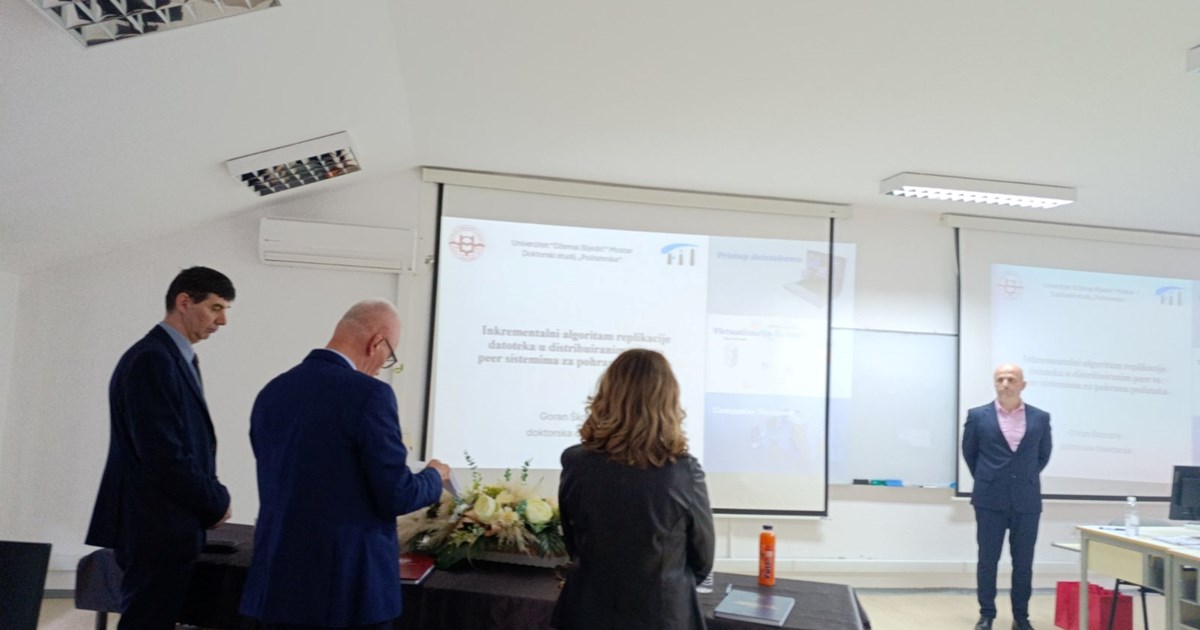 Kandidat doktorskog studija "Politehnika" mr. sc. Goran Škondrić je dana 21. marta 2025. godine uspješno odbranio doktorsku disertaciju pod naslovom "Inkrementalni algoritam replikacije datoteka u distribuiranim peer to peer sistemima za pohranu poda ...