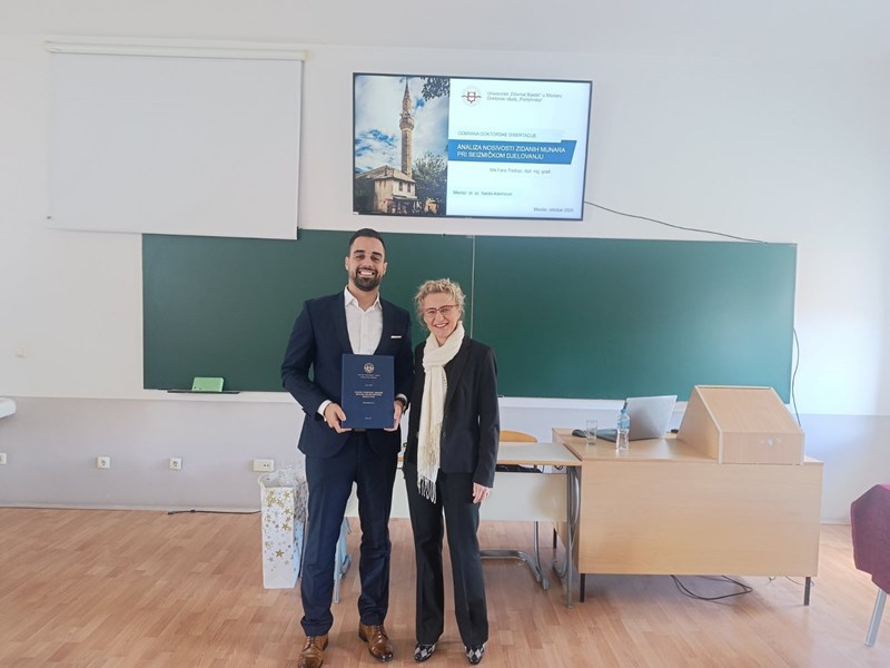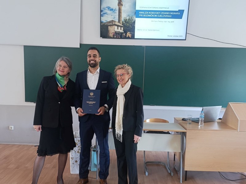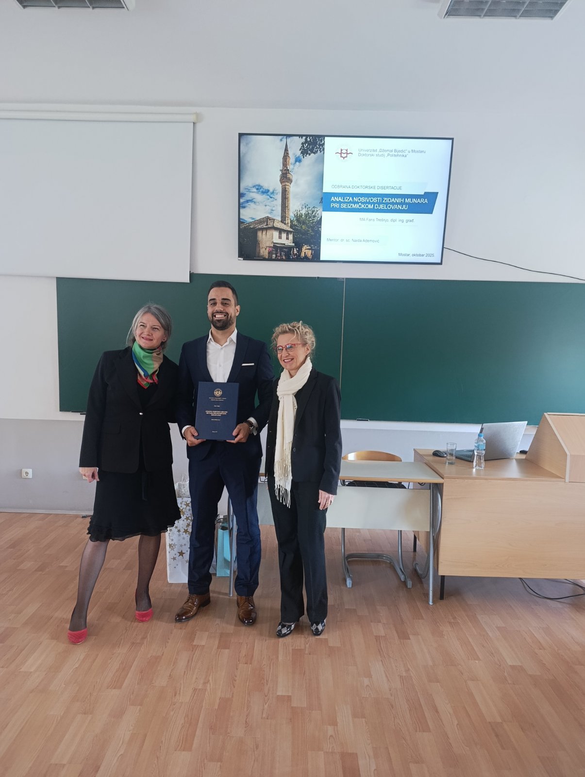 Kandidat doktorskog studija "Politehnika" mr. Faris Trešnjo je dana 27. oktobra 2025. godine uspješno odbranio doktorsku disertaciju pod naslovom "Analiza nosivosti zidanih munara pri seizmičkom djelovanju" i time ispunio zakonske uslove za sticanje akademskog stepena doktora nauka.